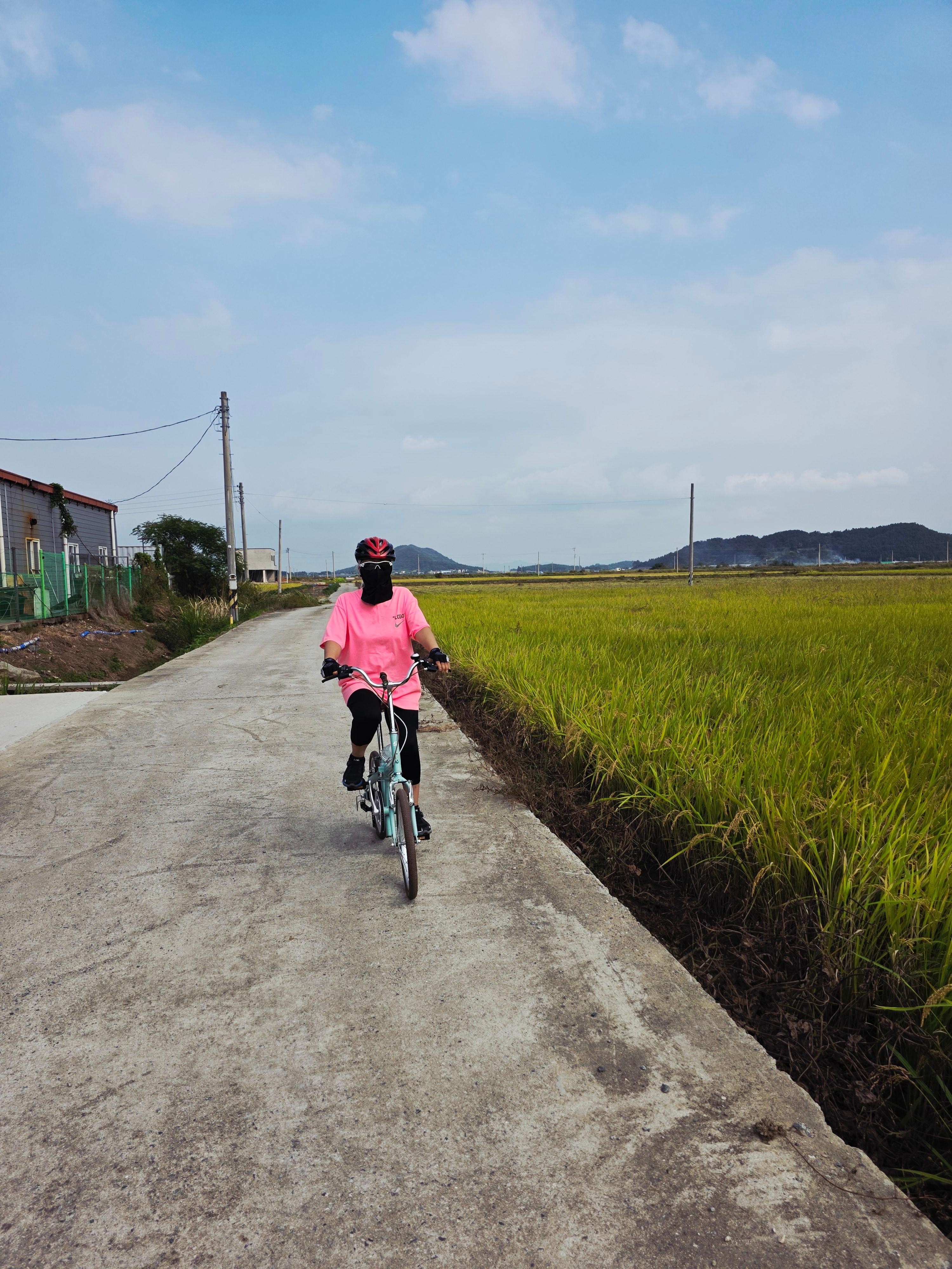 바퀴가 흙길 위를 부드럽게 굴러가고, 논 사이로 난 길이 끝없이 이어졌습니다.